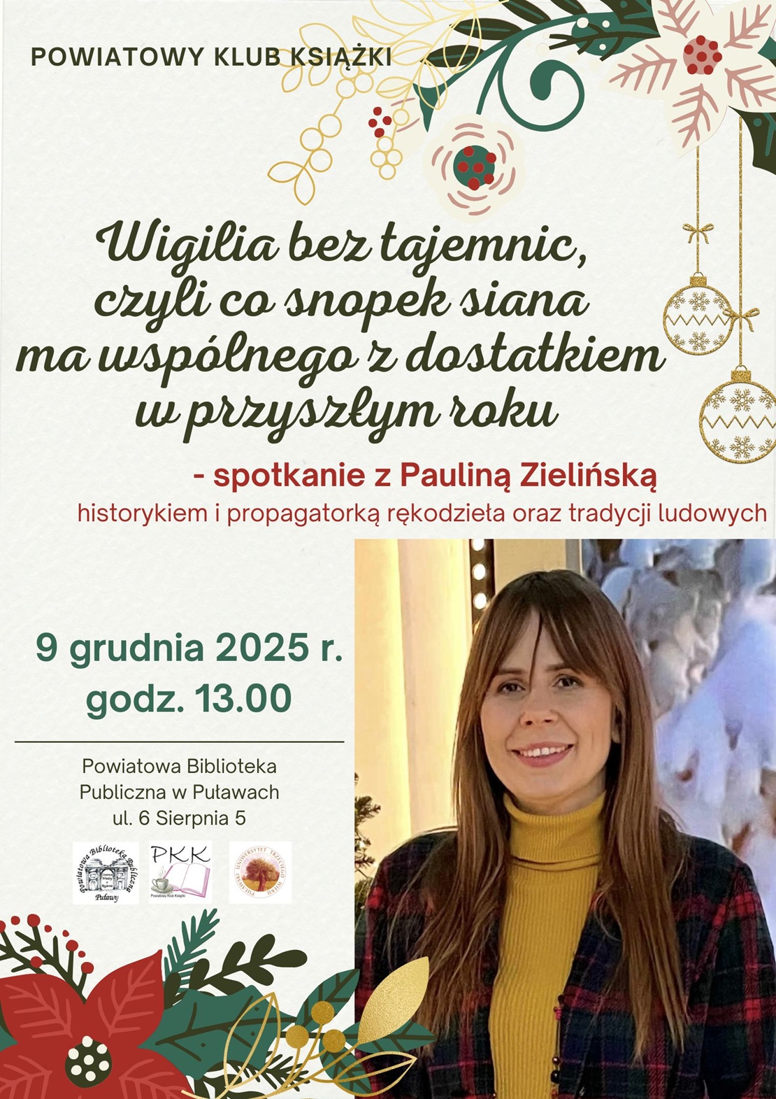 Powiatowa Biblioteka Publiczna w Puławach zaprasza na ostatnie w tym roku spotkanie Powiatowego Klubu Książki, które odbędzie się 9 grudnia 2025 r. o godzinie 13:00. Motywem przewodnim rozmowy będą zbliżające się Święta Bożego Narodzenia. Spróbujemy odpowiedzieć na pytania: