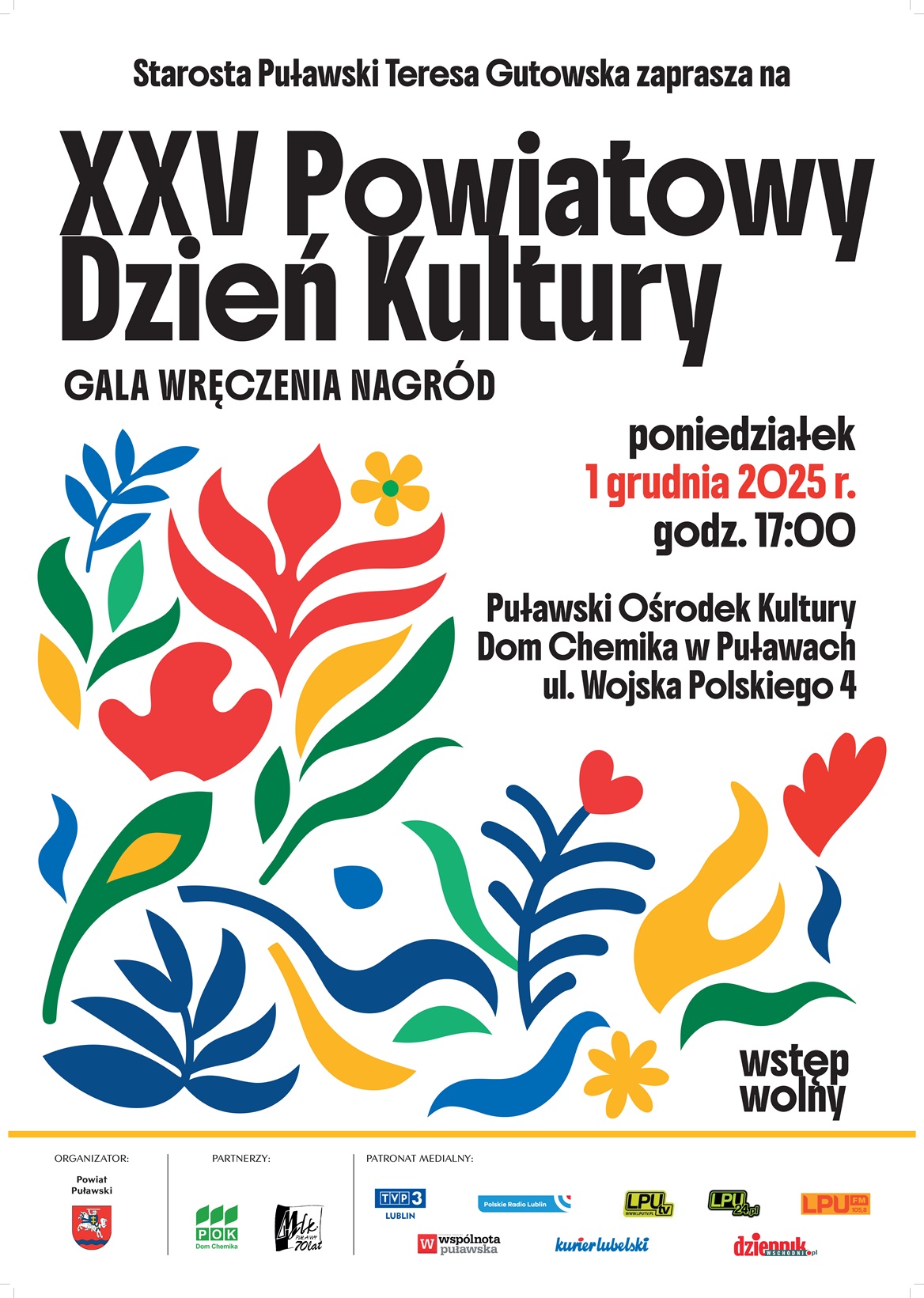 Serdecznie zapraszamy na jubileuszowy XXV Powiatowy Dzień Kultury, który odbędzie się w poniedziałek, 1 grudnia 2025 r. o godz. 17:00 w Puławskim Ośrodku Kultury „Dom Chemika”.