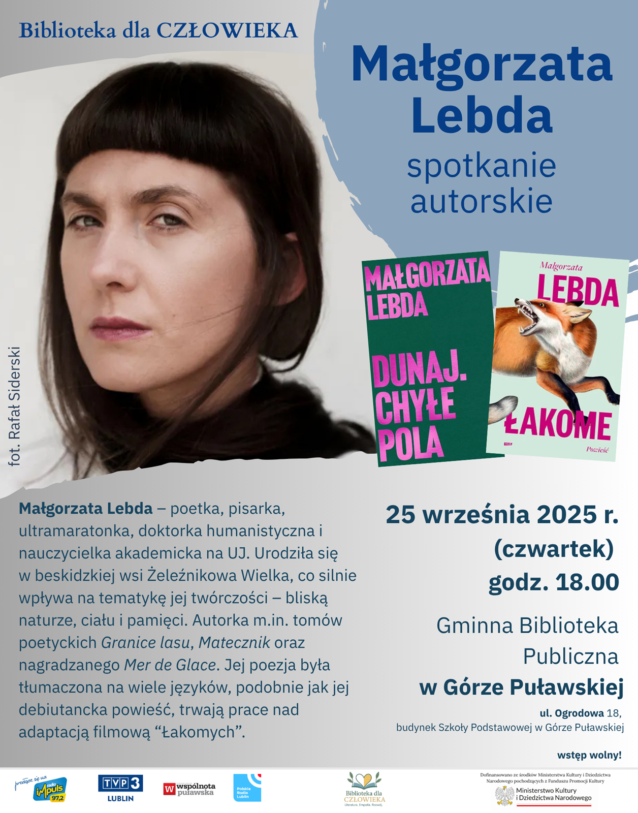 Gminna Biblioteka Publiczna w Górze Puławskiej serdecznie zaprasza 25 września 2025 r. (czwartek) o godz. 18.00 na spotkanie autorskie z poetką i nagradzaną autorką powieści "Łakome" - Małgorzatą Lebdą.