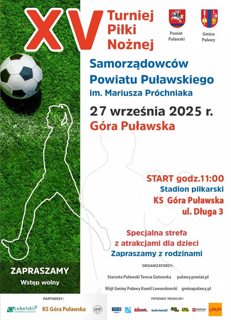 W imieniu Organizatorów serdecznie zapraszamy 27 września o godzinie 11:00 na XV Turniej Piłki Nożnej Samorządowców Powiatu Puławskiego im. Mariusza Próchniaka, który odbędzie się w Górze Puławskiej.