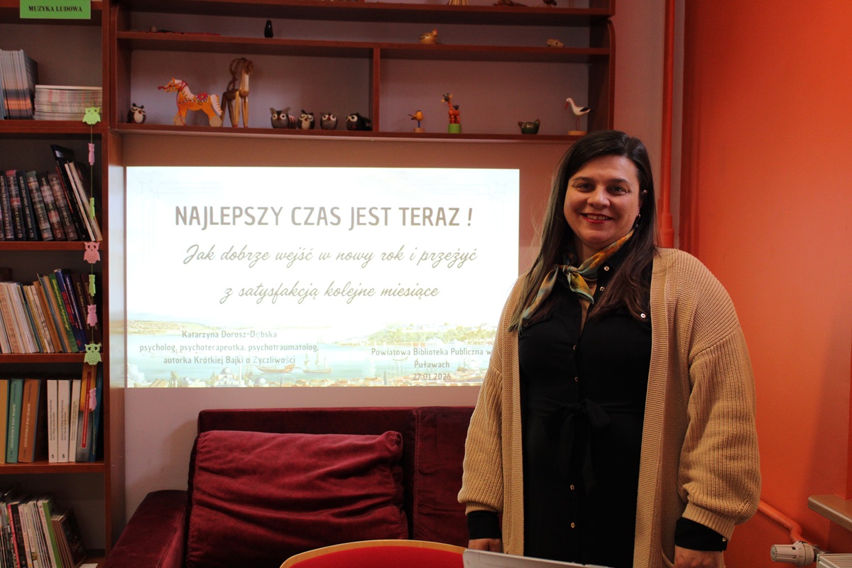 27 stycznia 2026 r. o godzinie 13.00 w Powiatowej Bibliotece Publicznej odbyło się pierwsze w nowym roku spotkanie Powiatowego Klubu Książki. Po raz kolejny nasze zaproszenie przyjęła Katarzyna Dorosz-Dębska – psycholog i psychoterapeutka dorosłych, dzieci oraz młodzieży, a także autorka książki „Krótka bajka o życzliwości”.