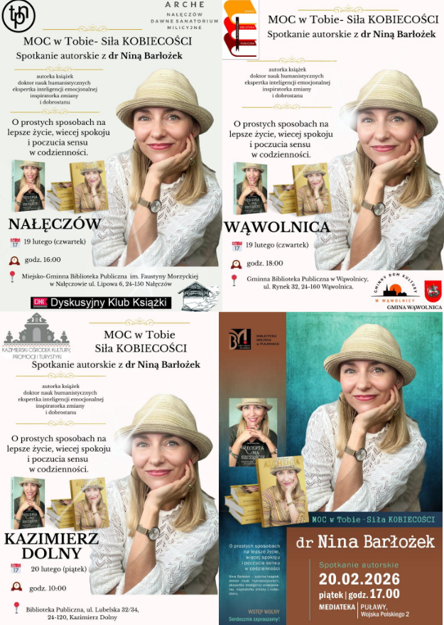 Serdecznie zapraszamy w imieniu bibliotek sieci powiatu puławskiego na spotkania z Niną Barłożek, doktorem nauk humanistycznych, ekspertką inteligencji emocjonalnej, inspiratorką zmiany i dobrostanu oraz autorką książek: „Recepta na szczęście”, „Alchemia codzienności”.