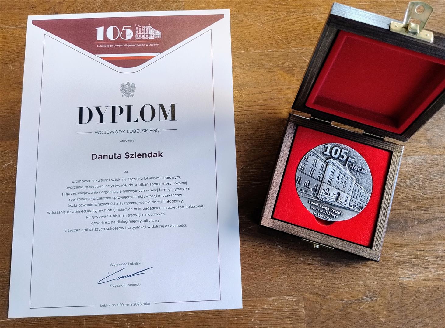 Niezwykle miło nam poinformować, że 30 maja 2025 r. z okazji Dnia Działacza Kultury, pani dyrektor Powiatowej Biblioteki Publicznej Danuta Szlendak została uhonorowana przez wojewodę lubelskiego Krzysztofa Komorskiego dyplomem za szczególne zasługi w promowaniu czytelnictwa, krzewieniu kultury słowa oraz za to że dzięki jej wieloletniemu zaangażowaniu Powiatowa Biblioteka stała się centrum wiedzy o regionie. Podczas uroczystości pani dyrektor otrzymała również Medal 105-lecia Urzędu Wojewódzkiego w Lublinie.